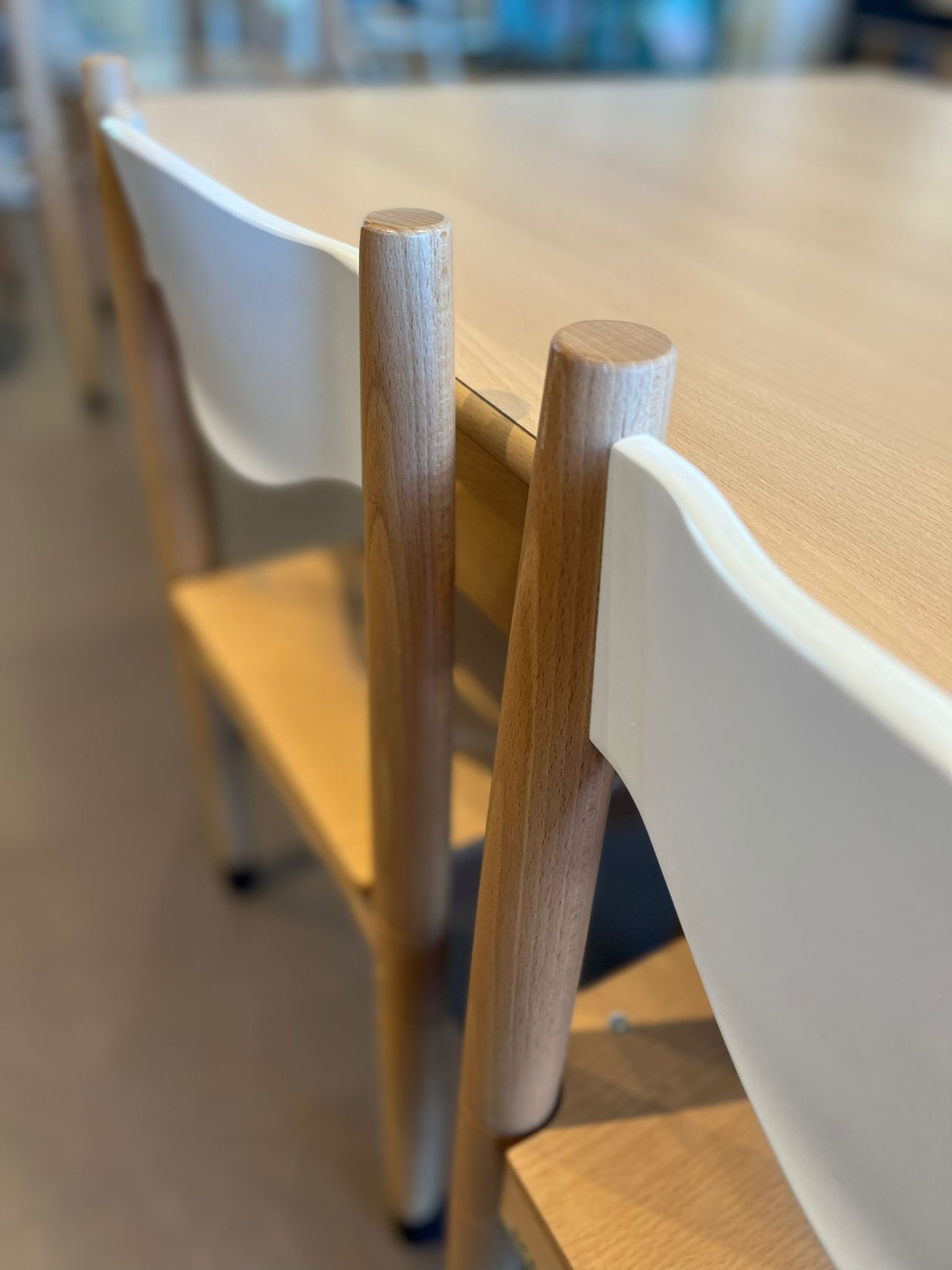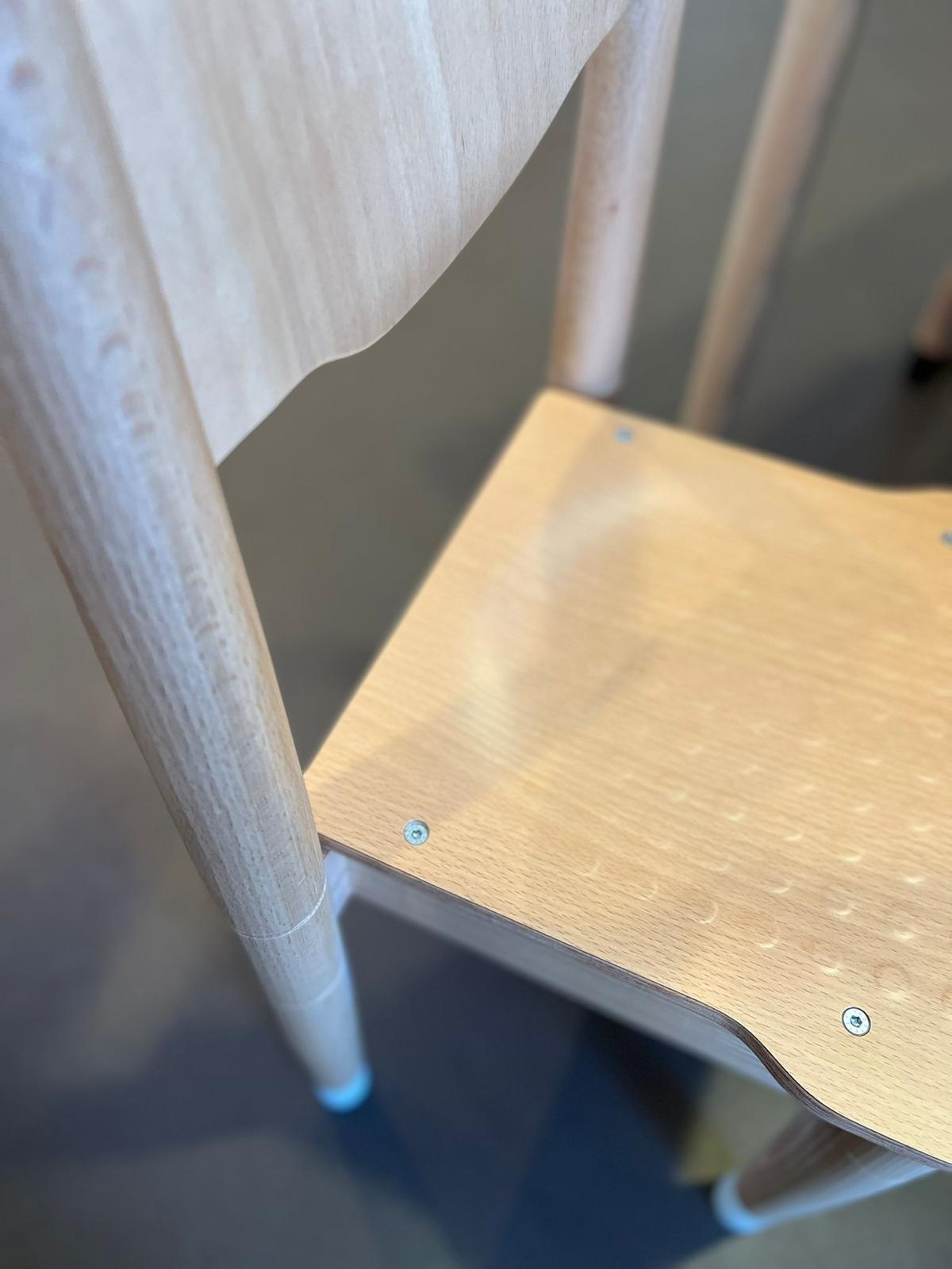 SDer Stuhl ist standardmäßig mit einer klar lackierten Rückenlehne ausgestattet.