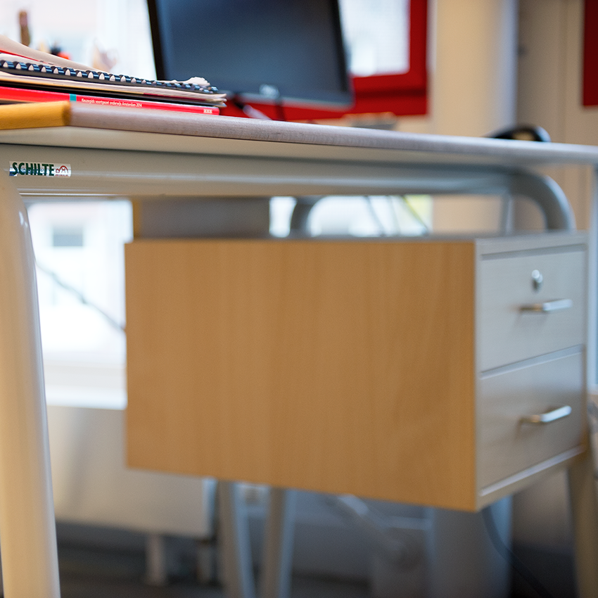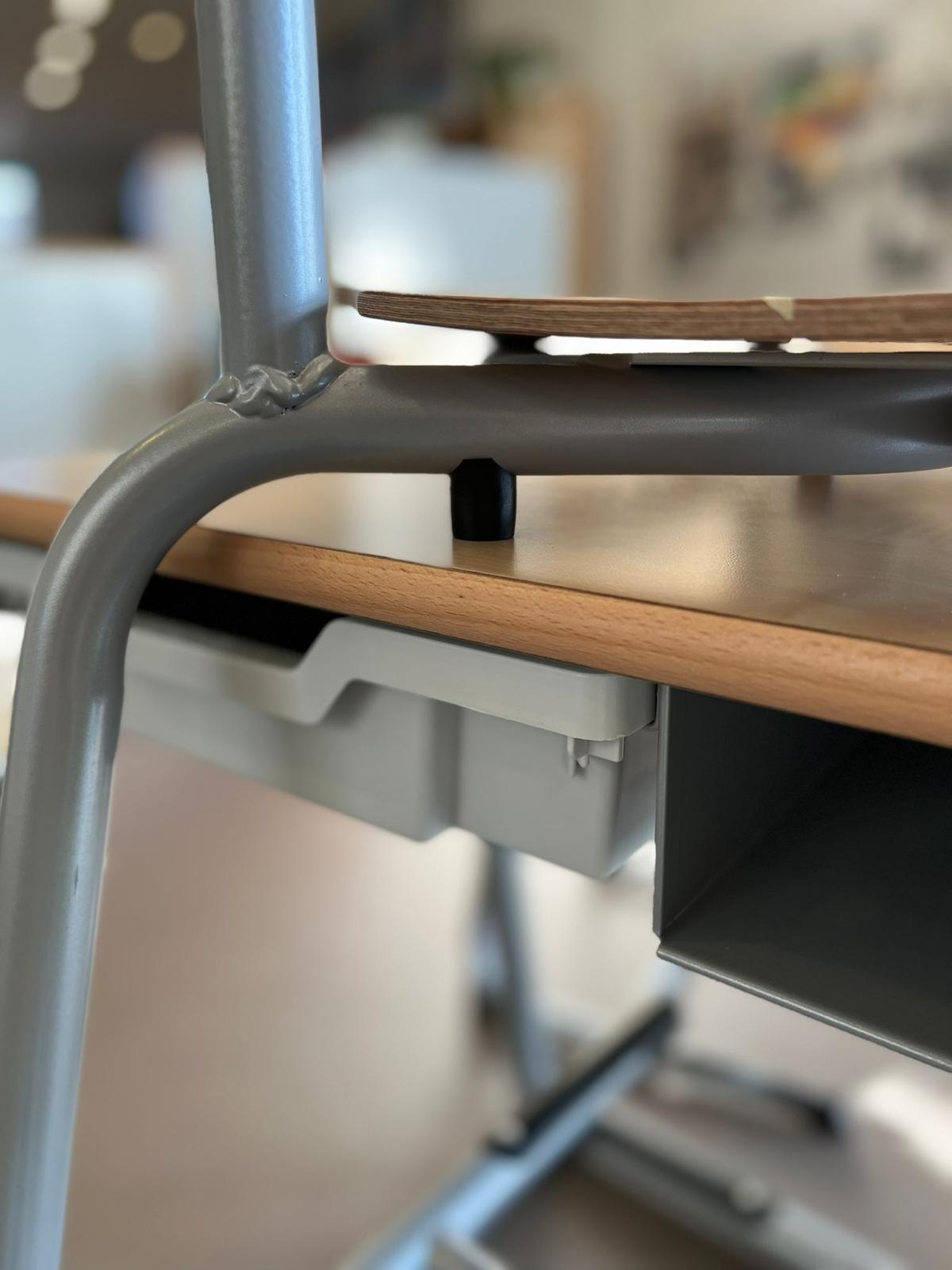 Ook deze tafels kenmerken zich door de ronde buis, slededoppen heeft ter bescherming van het frame. De tafels hebben een hoogte aanduiding d.m.v. kleurcodering in de dop. Het tafelblad is krasvaste en is verkrijgbaar in de hoogten B2 t/m G7.