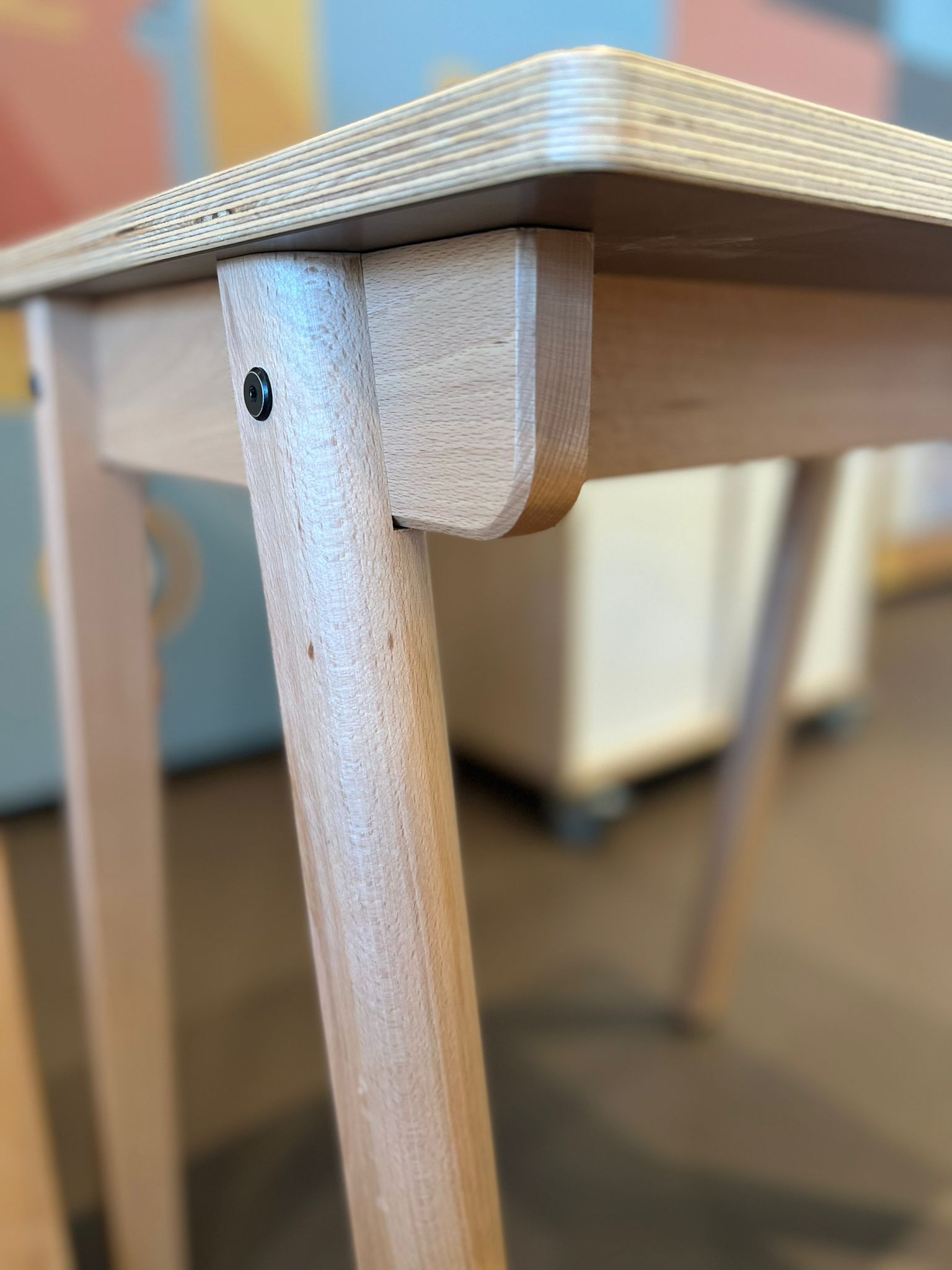 Die Gestelle der Tische der Serie Socra sind aus massiver Buche gefertigt. Die Tischplatten bestehen aus Spanplatten, 2-seitig beschichtet mit HPL 0,8 mm dick und Buchenkanten