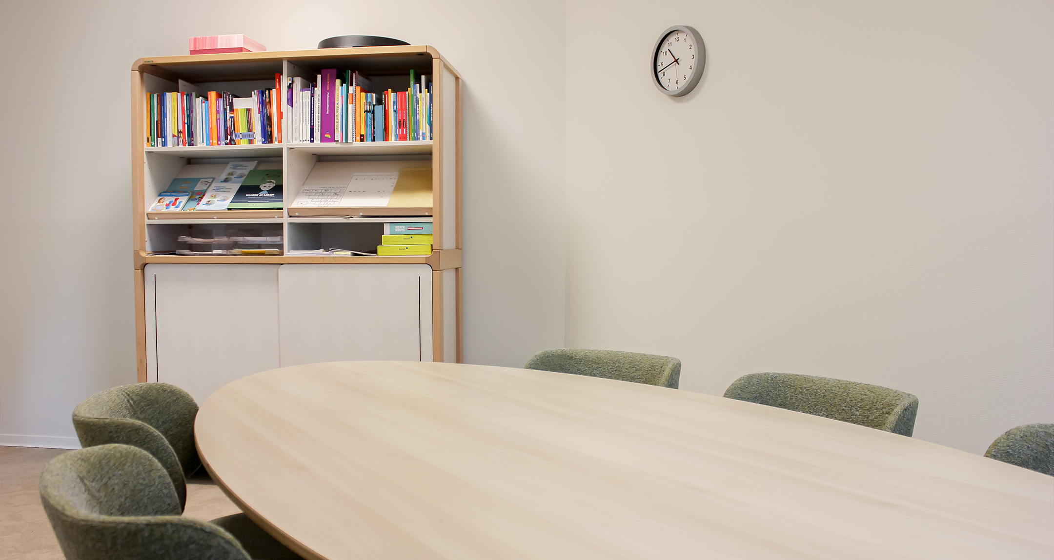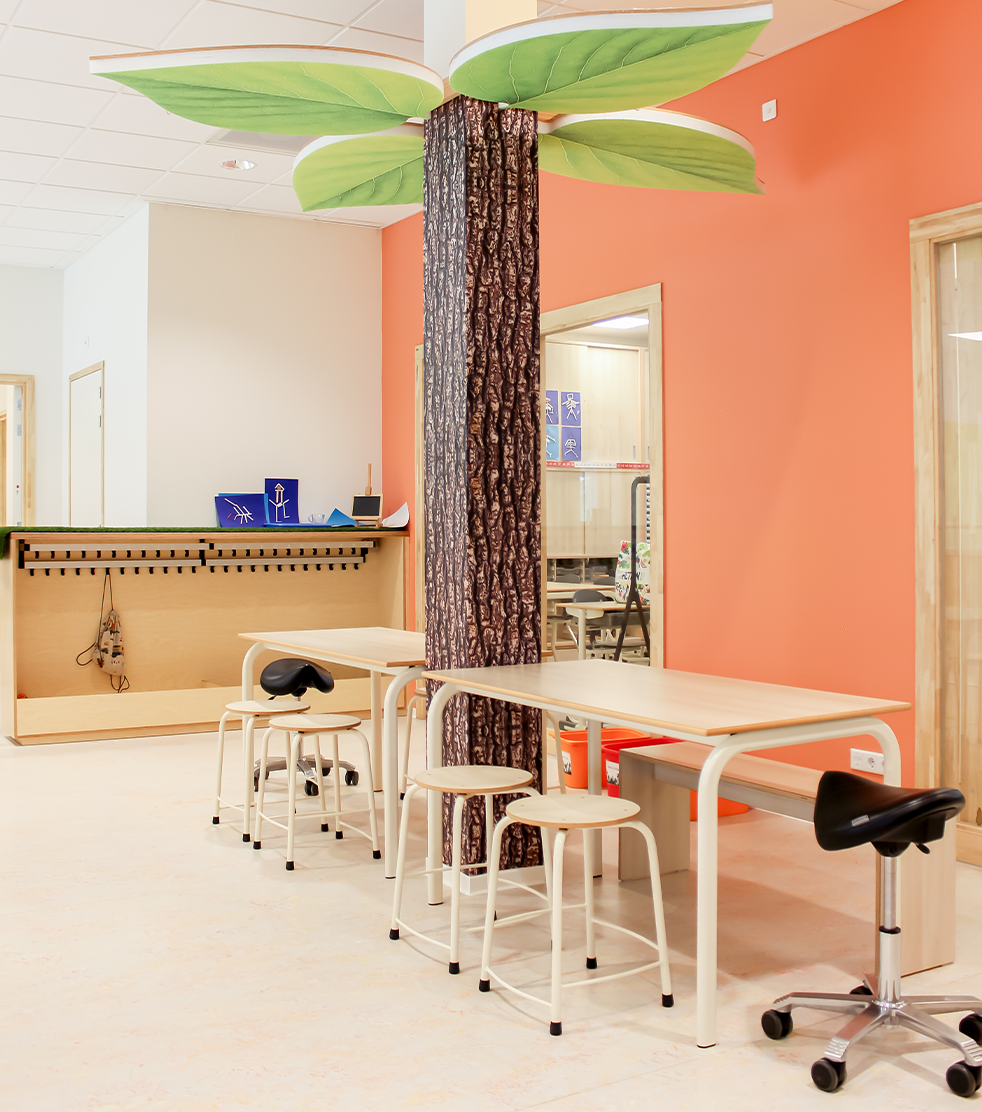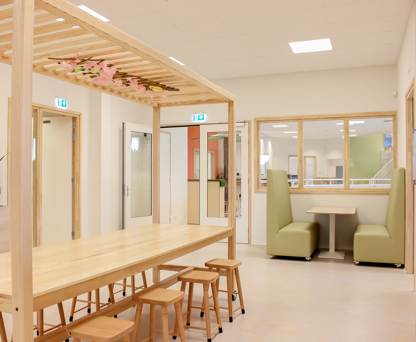 De teamkamer is ontworpen als een rustige, natuurlijke plek waar medewerkers zich kunnen terugtrekken, ontspannen of overleggen. Door het gebruik van groentinten en warme materialen ontstaat er een fijne werkomgeving. Het ontwerp is geïnspireerd op diverse bestaande scholen en projecten en combineert functionele oplossingen met een warme, uitnodigende uitstraling. Het resultaat is een interieur dat de pedagogische visie van IKC Fortuna zichtbaar en voelbaar maakt in elke ruimte van het gebouw.