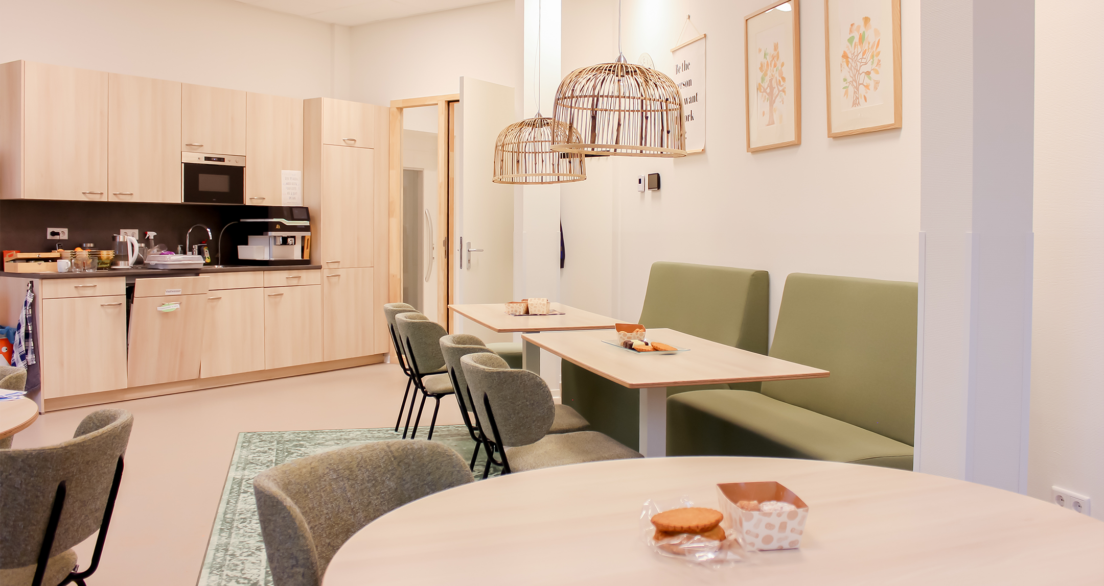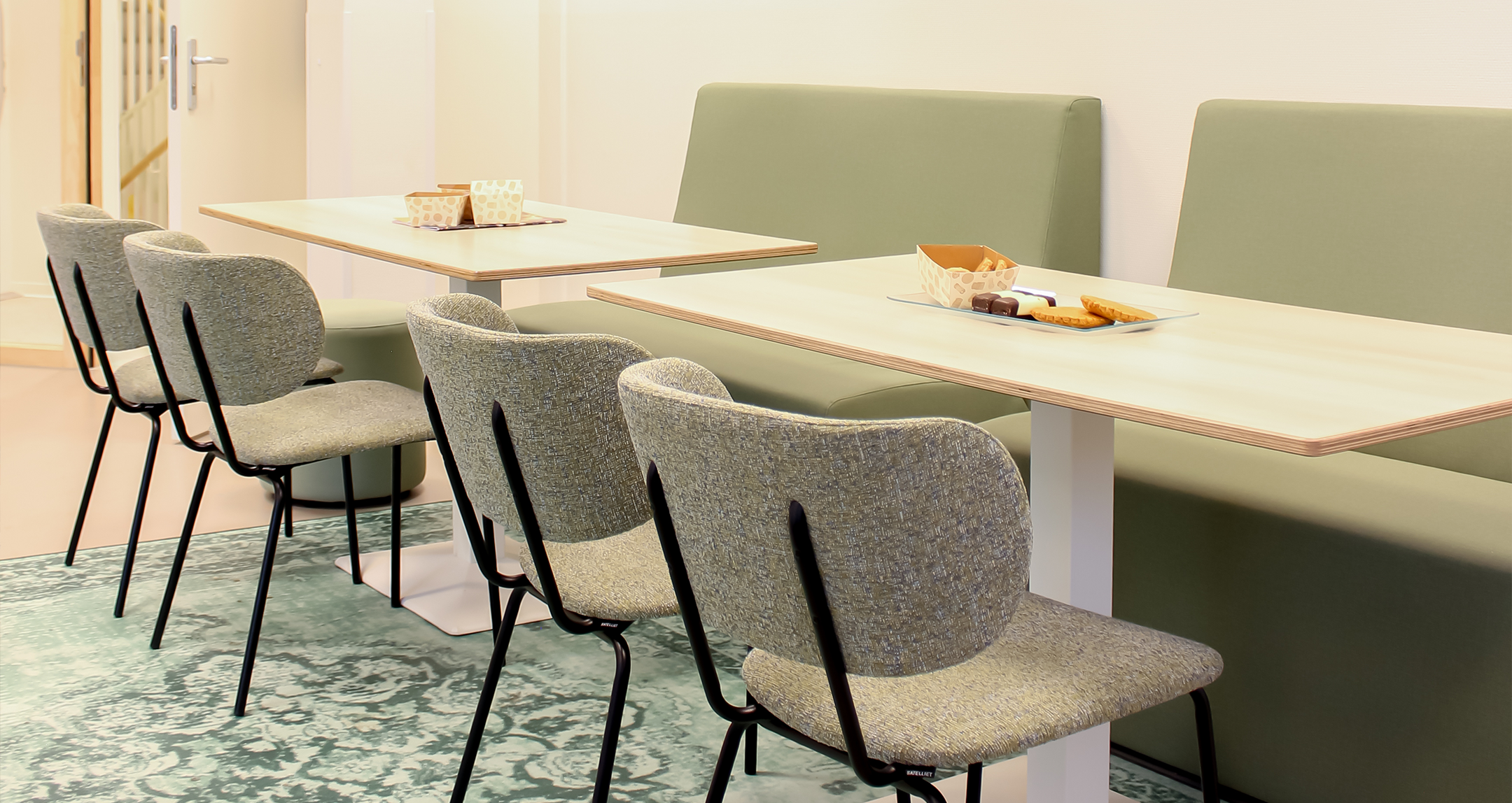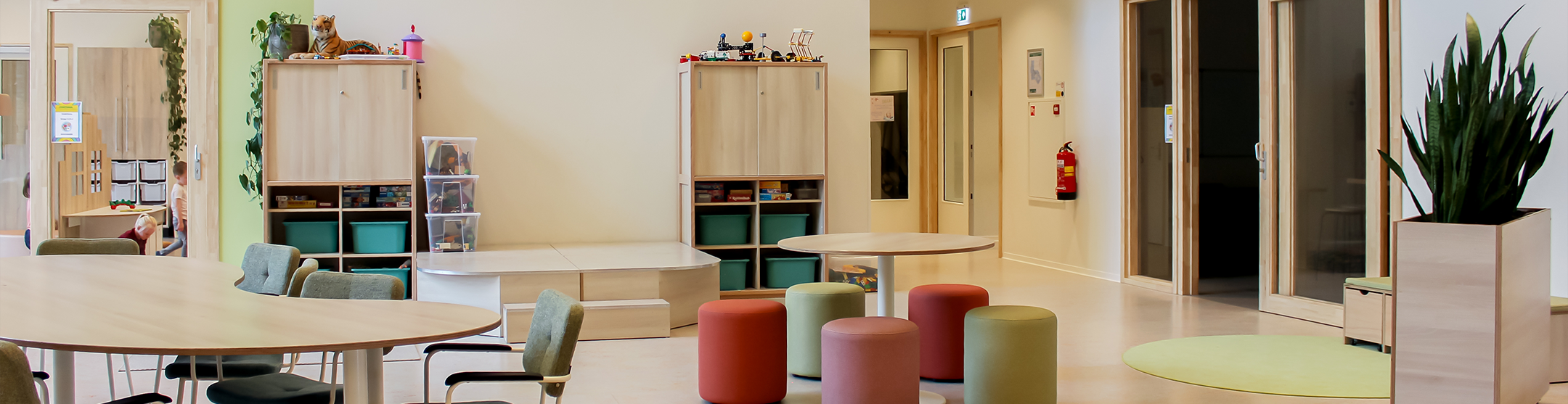 De teamkamer is ontworpen als een rustige, natuurlijke plek waar medewerkers zich kunnen terugtrekken, ontspannen of overleggen. Door het gebruik van groentinten en warme materialen ontstaat er een fijne werkomgeving. Het ontwerp is geïnspireerd op diverse bestaande scholen en projecten en combineert functionele oplossingen met een warme, uitnodigende uitstraling. Het resultaat is een interieur dat de pedagogische visie van IKC Fortuna zichtbaar en voelbaar maakt in elke ruimte van het gebouw.