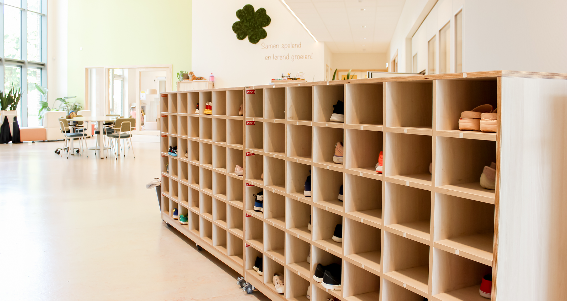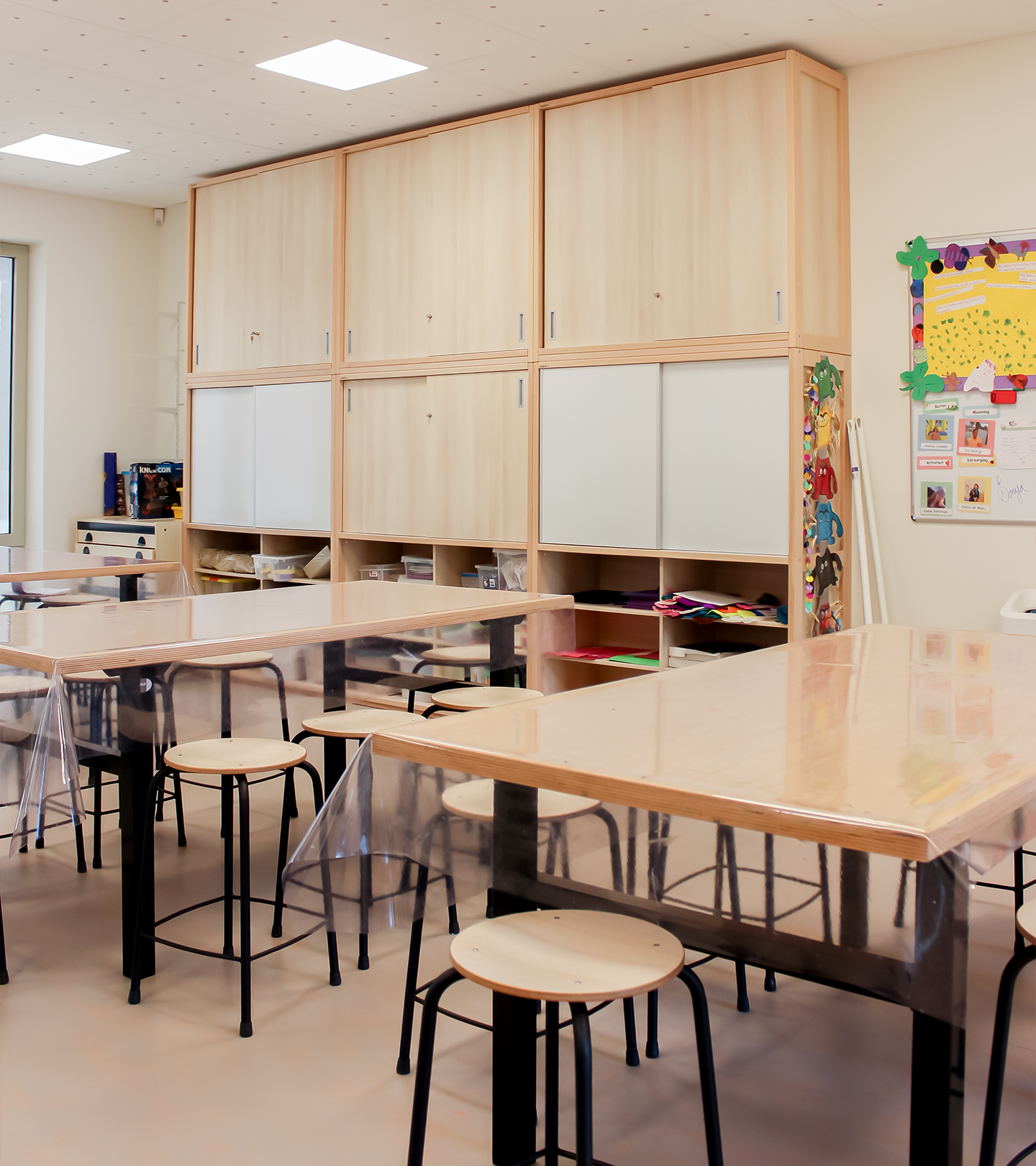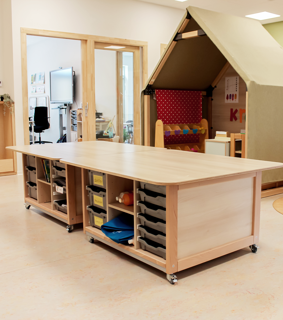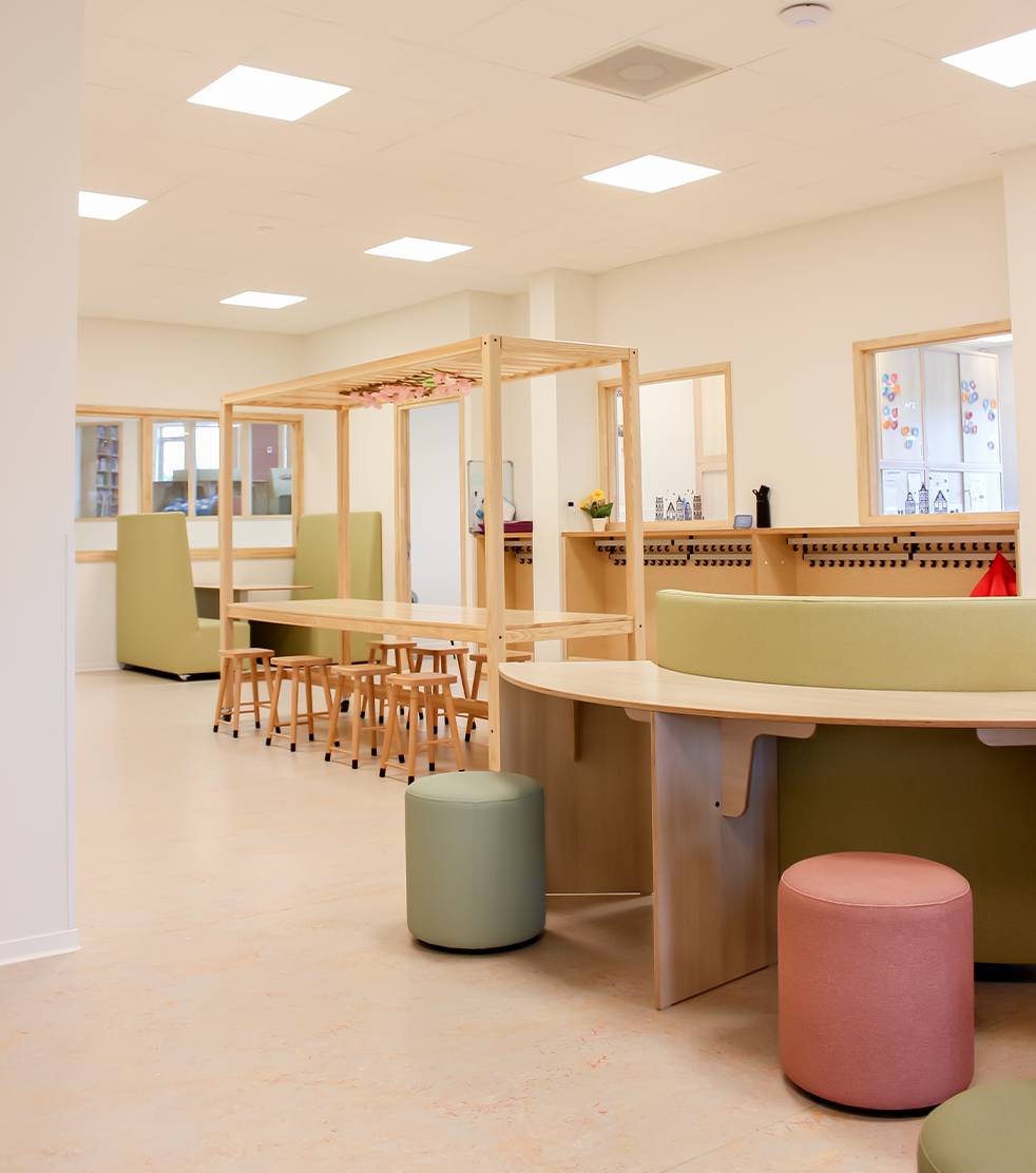 Op de begane grond bevinden zich de groepen 1 tot en met 3 en het peuterdeel, met ruime leerpleinen die uitnodigen tot spelend leren. Door het gebruik van speelhoekjes, creatieve zones en herkenbare elementen zoals huisjes, ontstaat er een dynamische leeromgeving. Op de eerste verdieping zijn de groepen 4 tot en met 8 en de teamkamer te vinden. Elke bouw heeft een eigen leerplein dat is afgestemd op de leeftijdsgroep. De inrichting sluit aan bij hun ontwikkeling, waarbij de leerpleinen van de bovenbouw een wat volwassener uitstraling hebben.